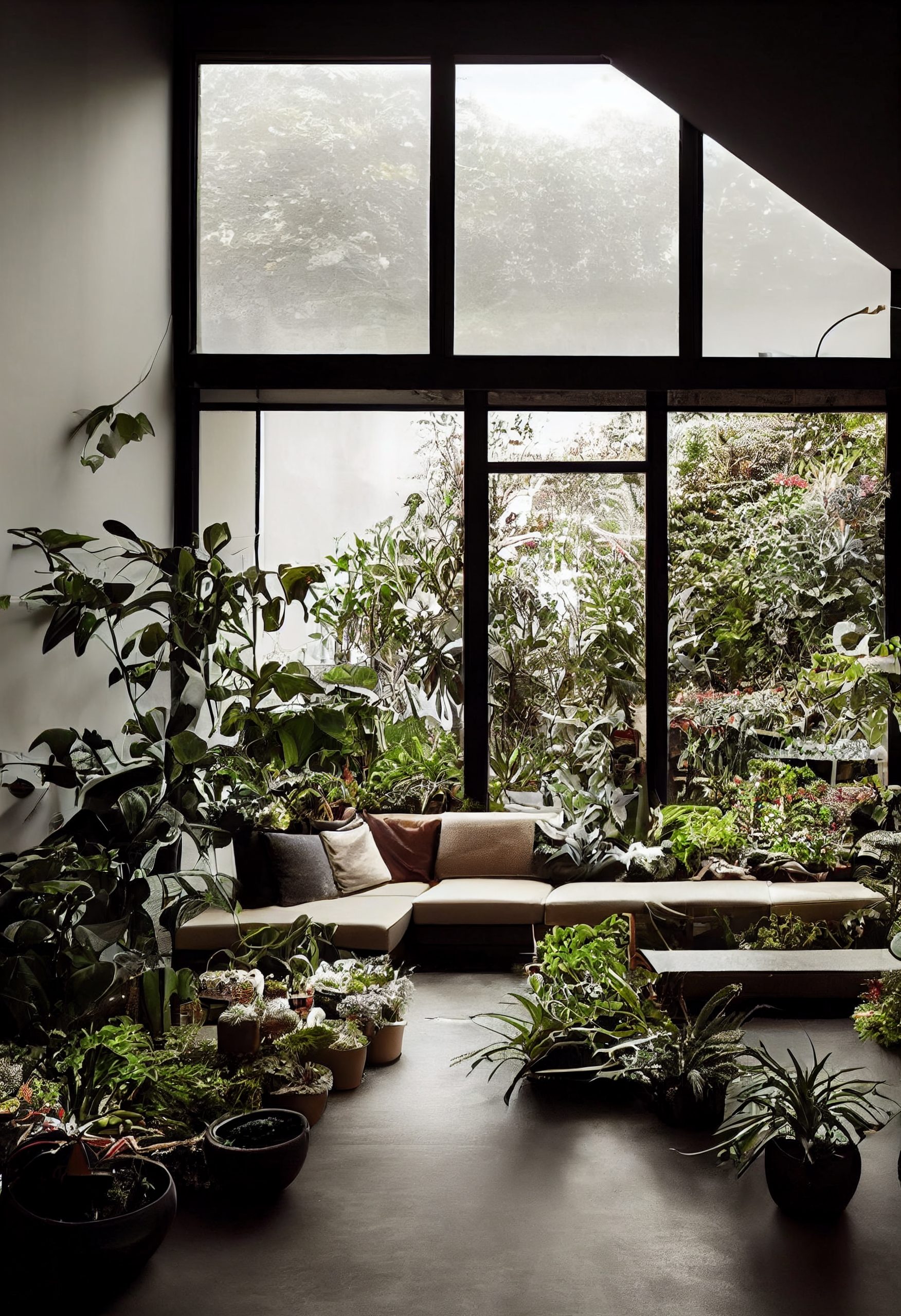 Elegant and comfortable living room.Stylish scandinavian living room with design furniture, plants, bamboo bookstand and wooden desk.The room has large windows. Looking out to see the scenery outside